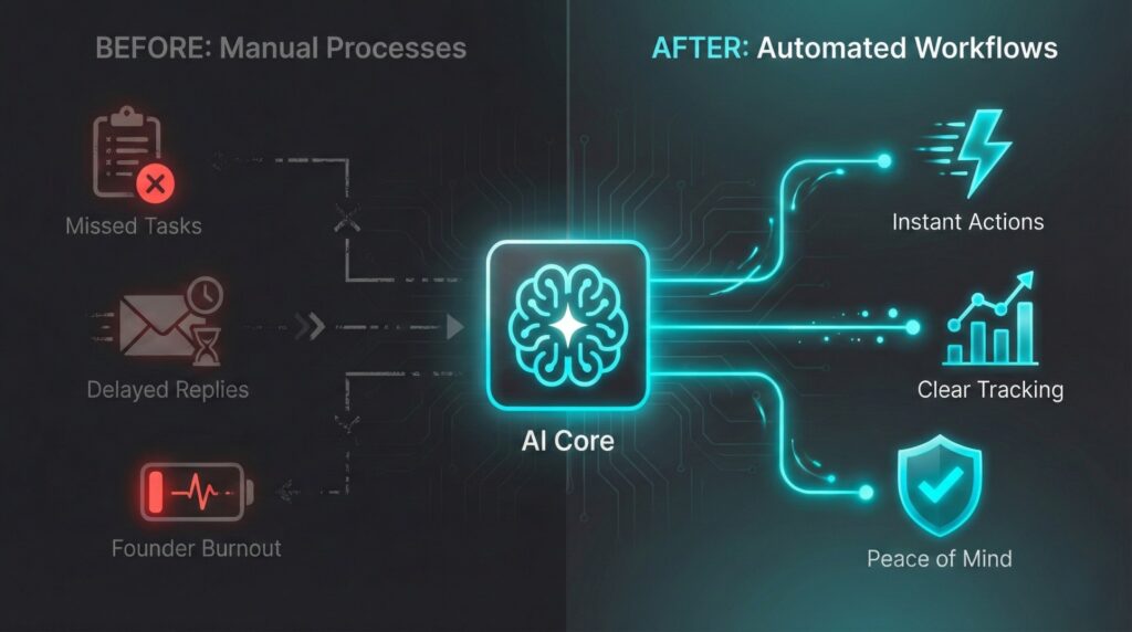 We help founders automate operations, follow-ups, reporting, and internal workflows using AI-powered systems — so your business runs smoothly without constant supervision.